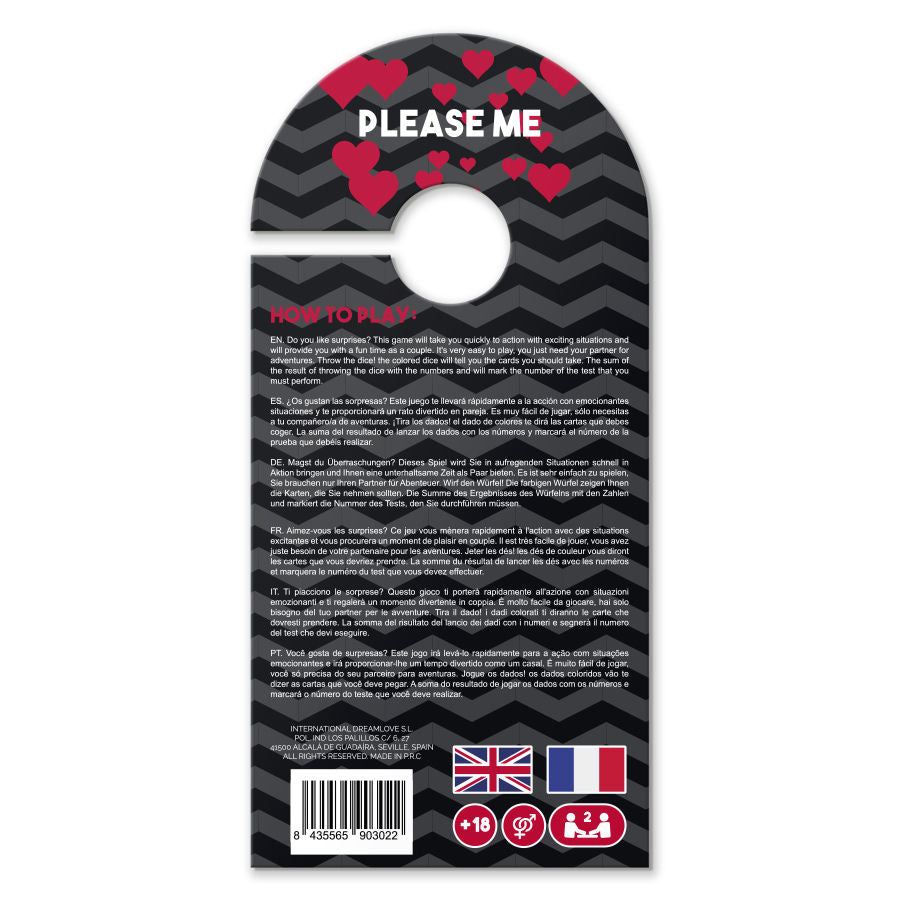 Mögen Sie Überraschungen? Dieses Spiel bringt Sie schnell in spannende Situationen und bietet Ihnen eine lustige Zeit zu zweit. Es ist sehr einfach zu spielen, Sie brauchen nur Ihren Abenteuerpartner. Werfen Sie die Würfel! Die farbigen Würfel zeigen Ihnen die Karten an, die Sie nehmen sollten. Die Summe der Würfelwürfe mit den Zahlen markiert die Nummer des Tests, den Sie werfen müssen.