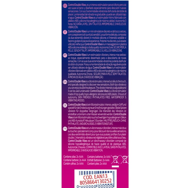 Mit seinen 2 vibrierenden Gliedmaßen werden Sie doppeltes Vergnügen haben. Die Intensität des Vibrators ist einstellbar und kann unter Wasser verwendet werden. Control Double Vibes ist ein Intimstimulator aus ABS-Kunststoff und hypoallergenem Silikon höchster Qualität.