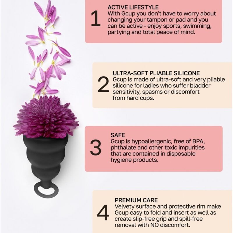 The Gcup menstrual cup is bell-shaped. The main advantage of the Gcup is the internal check valve. Thanks to the valve, fluid does not return to the vagina during an active lifestyle. You can do your daily activities, sports and even swim, completely forgetting about "these days." The Gcup has a soft and smooth surface, with the perfect size so you don't feel like it. Additionally, the bowls will save a significant amount compared to conventional pads and tampons. The Gcup menstrual cup is absolutely safe for women's health.