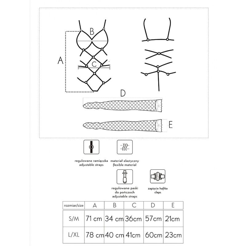 The top of the set consists of sexy black stripes, intertwined on the belly and connected with rings. The straps at the top elegantly surround the bust without covering it, while at the bottom they gently transform into a thong. Individual straps run down both sides of the thong, charmingly hugging the hips. The lower part of the set consists of black stockings of adjustable length, made of mesh. The stockings are fastened with clasps to the top element of the outfit, in front and back.