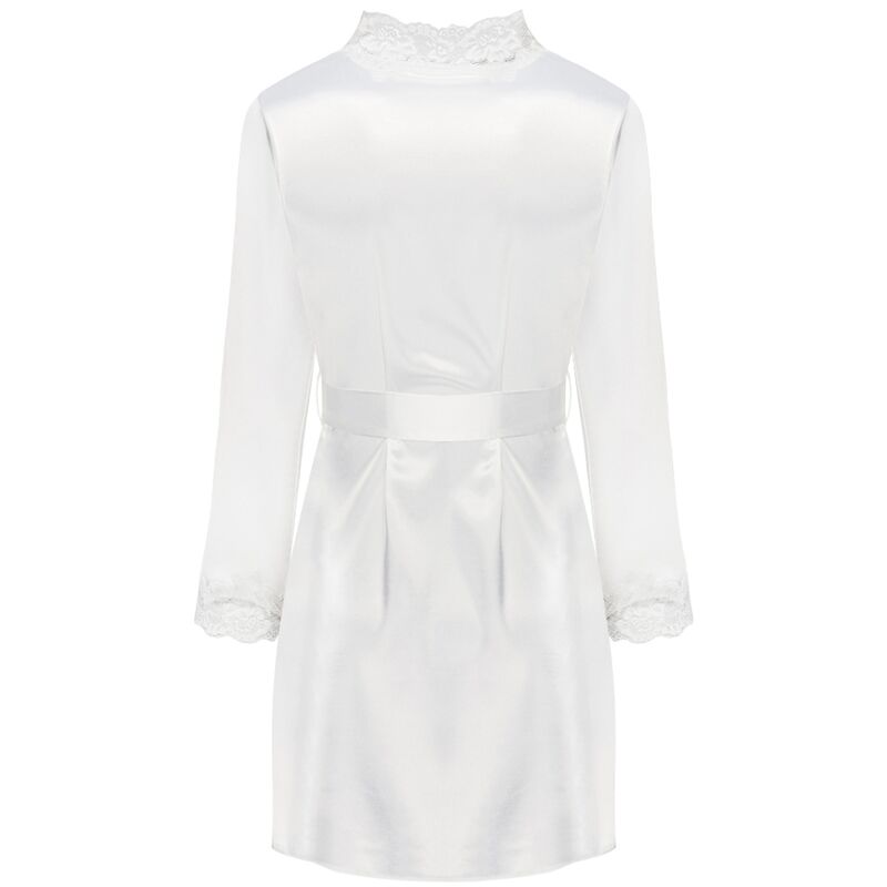 Um conjunto excepcionalmente lindo de roupa íntima feito de cetim cru brilhante, um roupão com uma chemise, chegando até o meio da coxa. A frente e as mangas longas do roupão amarradas na cintura com um cinto são decoradas com lindas rendas. Camiseta com alças finas e ajustáveis, decorada com a mesma renda no busto. Tanga incluída.